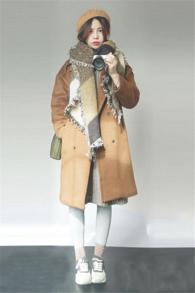 【搭配示范】:寬松毛衣連衣裙+駝色長(zhǎng)外套+同色系大圍巾+貝雷帽+運(yùn)動(dòng)鞋