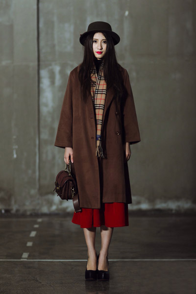 【搭配示范】:高領(lǐng)毛衣+半身紅長(zhǎng)裙+咖啡色大衣+駝色經(jīng)典格子圍巾+小禮帽+黑色高跟鞋