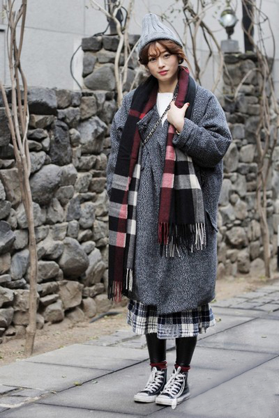 【搭配示范】:寬松襯衫裙+麻灰長(zhǎng)外套+格子圍巾+灰色毛線帽+球鞋