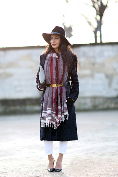【搭配示范】:黑色長(zhǎng)外套+酒紅大圍巾+寬檐帽+白褲子+黑色高跟鞋+金屬腰帶