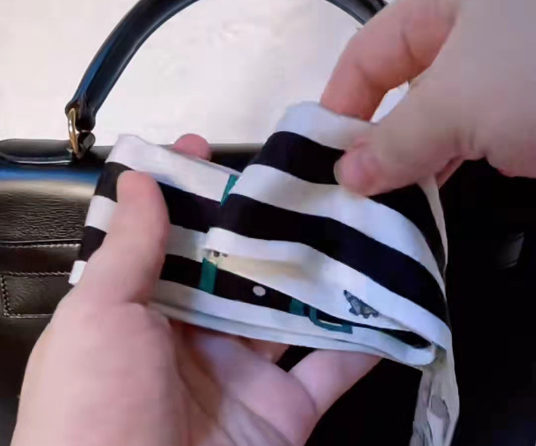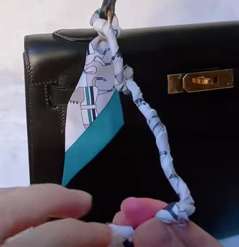絲巾在包柄中間對(duì)折,把絲帶交叉繞過(guò)包柄,注意一定要繃緊絲帶,系出來(lái)的辮子才會(huì)整齊不容易散,繞到底部的時(shí)候,把絲帶穿過(guò)金屬扣,然后打結(jié)。