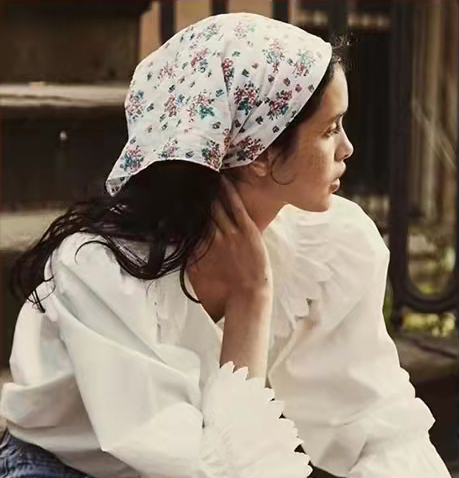 半包裹式的用法,充滿了復(fù)古風(fēng)情,在露出額頭部分的頭發(fā),在花紋的選擇上以格紋和碎花為主。