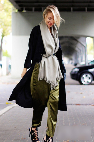 純色圍巾不管過多久都不會過時,在腰間系上腰帶,圍巾瞬間就變做了一件上衣,搭配長外套,時尚街拍好look。