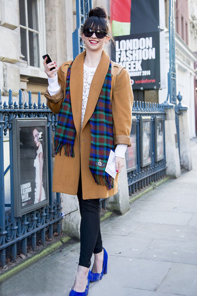 土黃色bf風(fēng)大衣,既帥氣舒適又提亮膚色,一顆丸子頭清爽可愛。這一身最為出彩的當(dāng)屬寶藍(lán)色高跟鞋和間寶藍(lán)色格子圍巾的搭配,完美呼應(yīng),不落俗套,潮范兒十足。