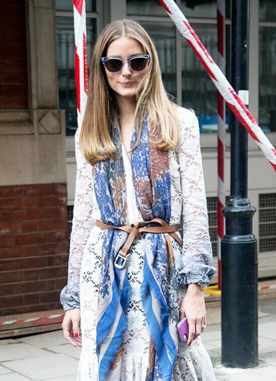 像奧利維亞這樣直接將長絲巾放下,用一根細腰帶勾勒腰線也十分chic哦,尤其是當服飾單品沒有太多設計細節(jié)時,一款印花長絲巾簡直就是提升造型吸睛指數(shù)的最佳利器,當然,如果能像奧利維亞這樣搭配一條與服飾同色系的長絲巾則更加出眾,時髦菇?jīng)鲒s緊嘗試吧。