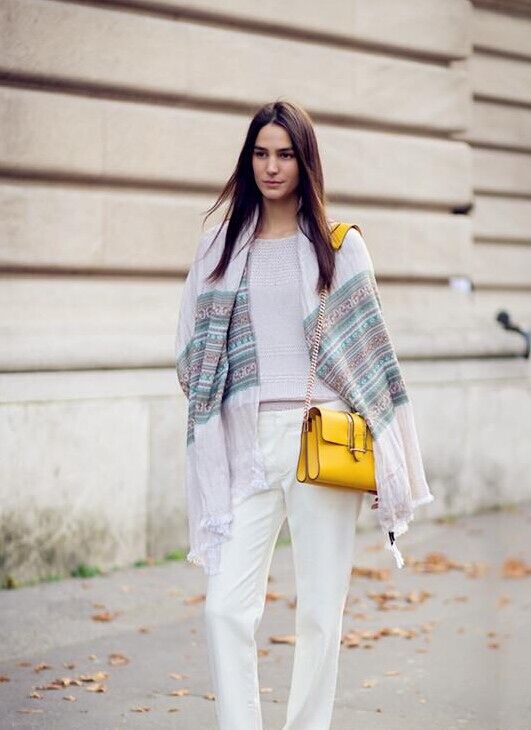 一款素雅的印花絲巾搭配同色系灰色針織衫,極簡優(yōu)雅又很有街頭休閑范。配上一條時下正熱的白色闊腿褲,時尚指數(shù)瞬間上升。亮眼的黃色鏈條包十分搶鏡,惹眼的色彩瞬間點亮整個造型,而腳上的棕色平底涼鞋也與長絲巾色彩呼應,整個look不夸張、不媚俗,舒適又優(yōu)雅。