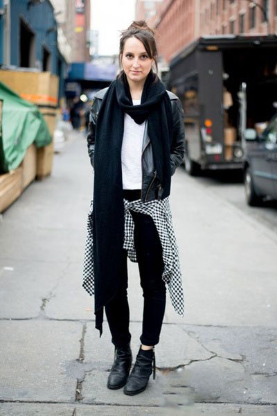 黑色的羊絨圍巾有著濃濃的哥特氣息,搭配黑色單品再好不過,黑色皮衣和黑色羊絨圍巾的長短錯落有致,打造出帥氣隨意的酷感。