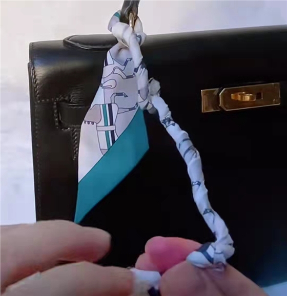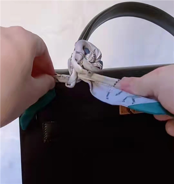 絲巾在包柄中間對折,把絲帶交叉繞過包柄,注意一定要繃緊絲帶,系出來的辮子才會(huì)整齊不容易散,繞到底部的時(shí)候,把絲帶穿過金屬扣,然后打結(jié)。