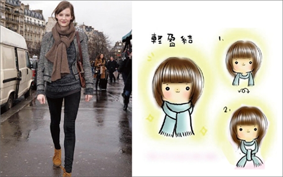 step 1:把圍巾繞在脖子上打一個結,打結處要留一點空隙