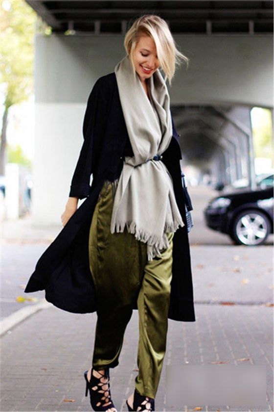 純色圍巾不管過(guò)多久都不會(huì)過(guò)時(shí),在腰間系上腰帶,圍巾瞬間就變做了一件上衣,搭配長(zhǎng)外套,時(shí)尚街拍好look。