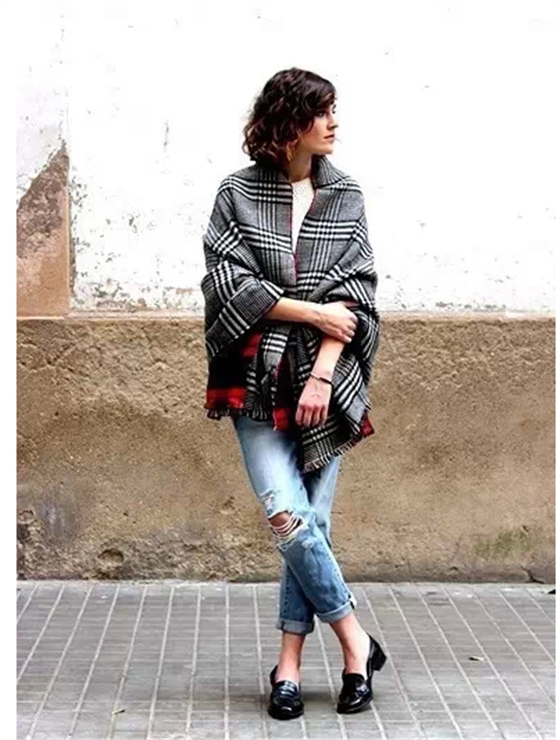 把方的羊絨圍巾當(dāng)做斗篷或者披肩來(lái)披可算是時(shí)下最“夯”的穿法了。不但沒有外套、大衣那么臃腫,反而能讓你“走路有風(fēng)”做個(gè)性感又迷人的“風(fēng)一般的女紙”。